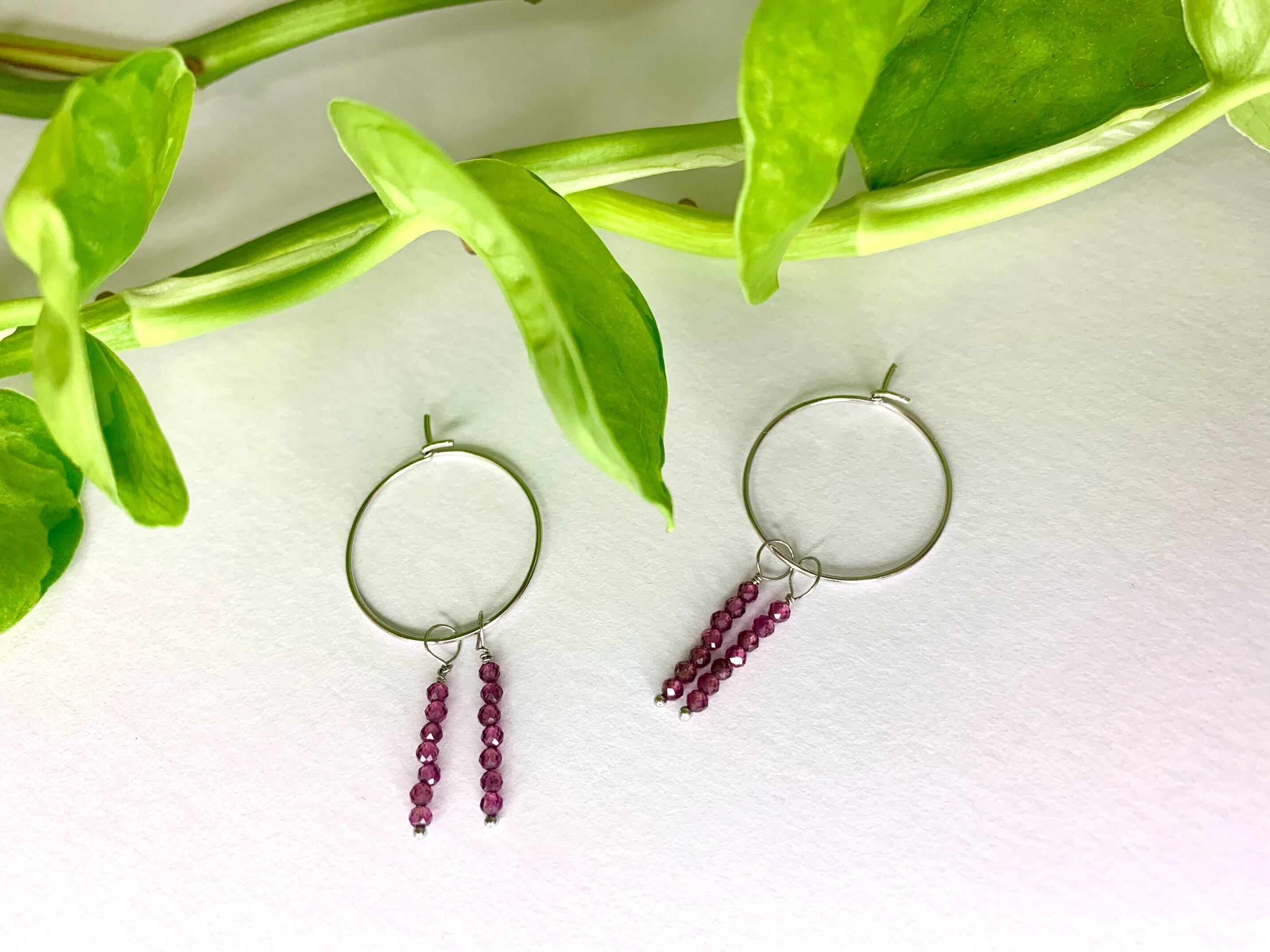 甘さと力強さを併せ持つロードライドガーネット2連ピアス。ラウンドカットを使用しているため、耳元で揺れるたびにキラキラと光り、華奢なデザインながらも、ガーネットの存在感で存在感あるピアスになっています。