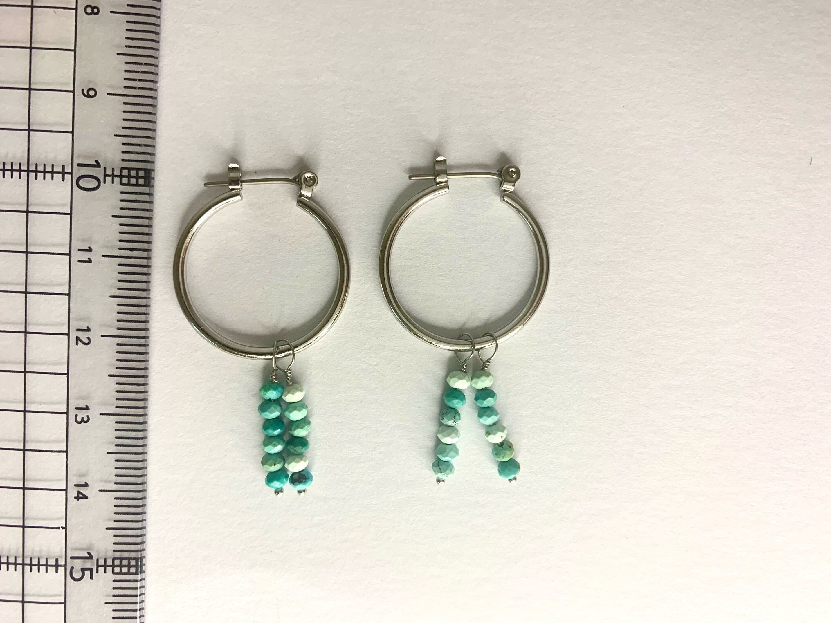 ターコイズのボタンカットを繋ぎわせたパーツを2連にしたピアスです。存在感があり、色のグラデーションも楽しむことができます。